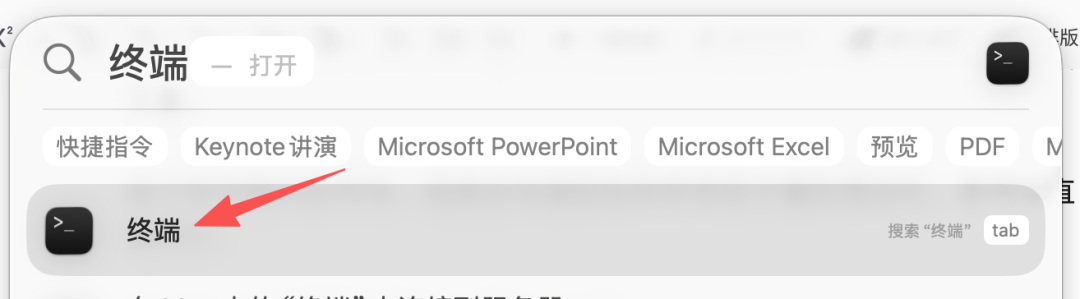 苹果电脑的「终端」启动方式有两种,第一种也是最快的一种,就是按住键盘的「Command 键 + 空格」,然后在弹出的搜索框里输入「终端」两个字。