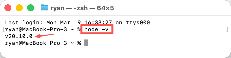 第一种,是输出一个类似下图一样的版本号,我电脑之前安装过,所以看到 Node.js 的版本号是 v20.10.0。
