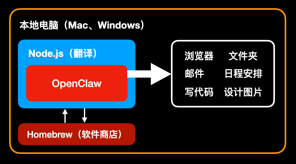 Node.js 是一个运行环境,它是 OpenClaw 和电脑之间的翻译。Homebrew 是一个综合软件商店,是用来安装和管理 Node.js 的。