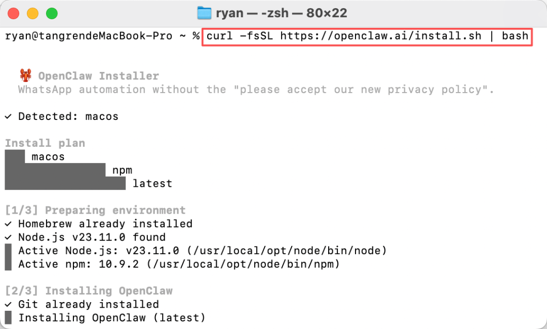 虽然过程繁多且看起来比较复杂,其实往回看也就三步,安装 Homerew 软件商店、安装翻译 Node.js、安装 Openclaw。