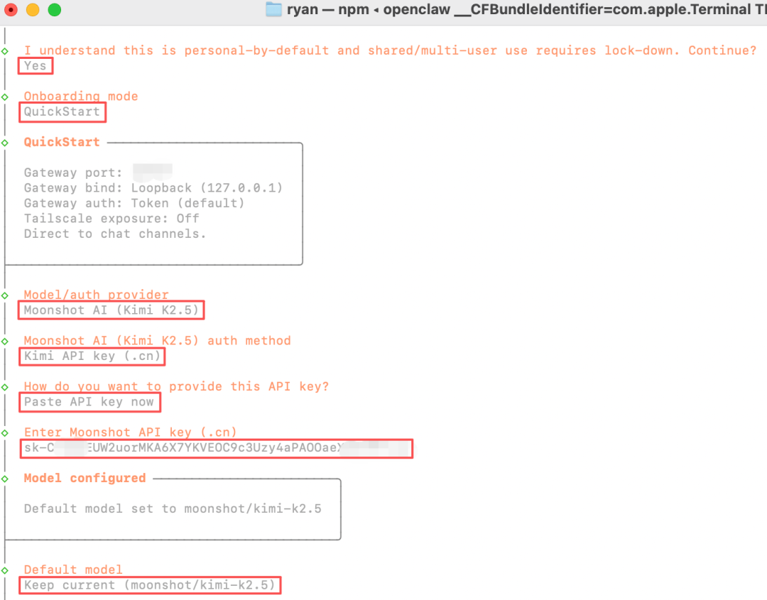 按照 OpenClaw 的初始化提示,把 API Key 粘贴进去,做粘贴这一步动作时,你在命令行是看不到输入的,粘贴后直接按回车就行。