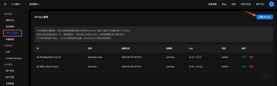 进入 Kimi 的 API 管理后台,点击新建 API Key,按操作执行即可。