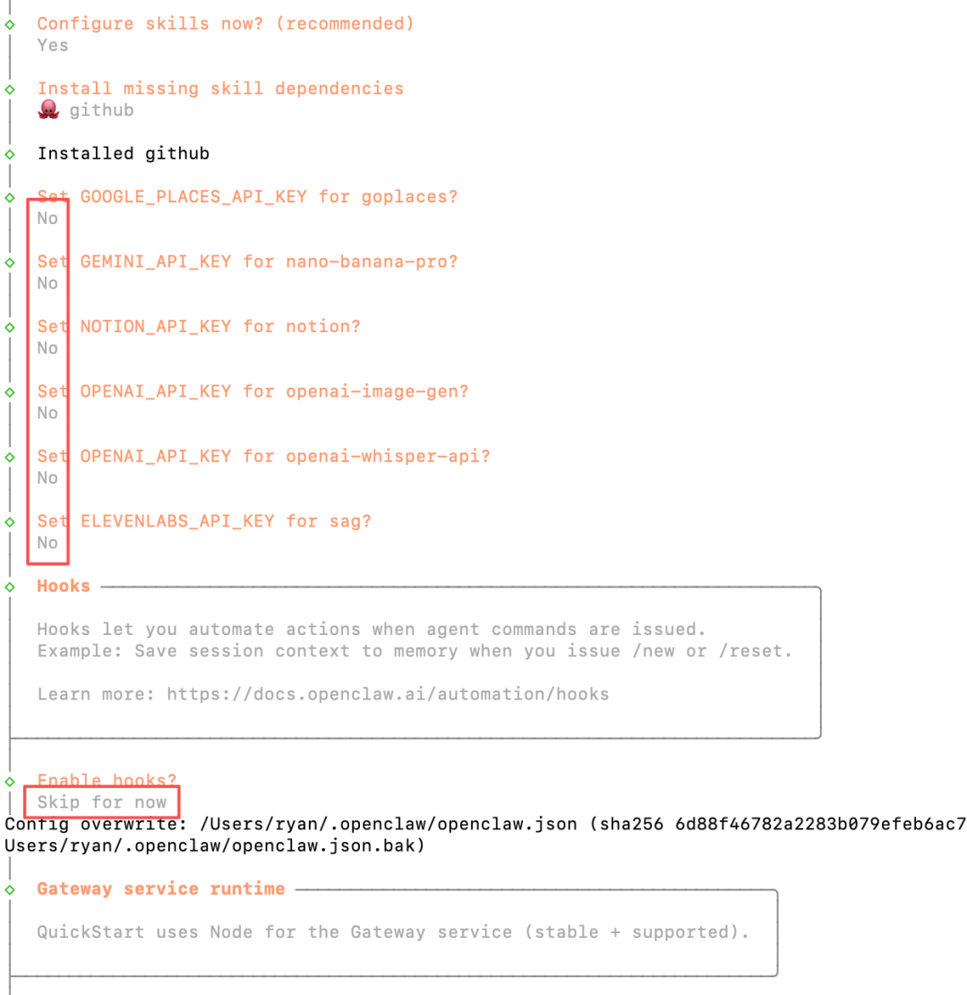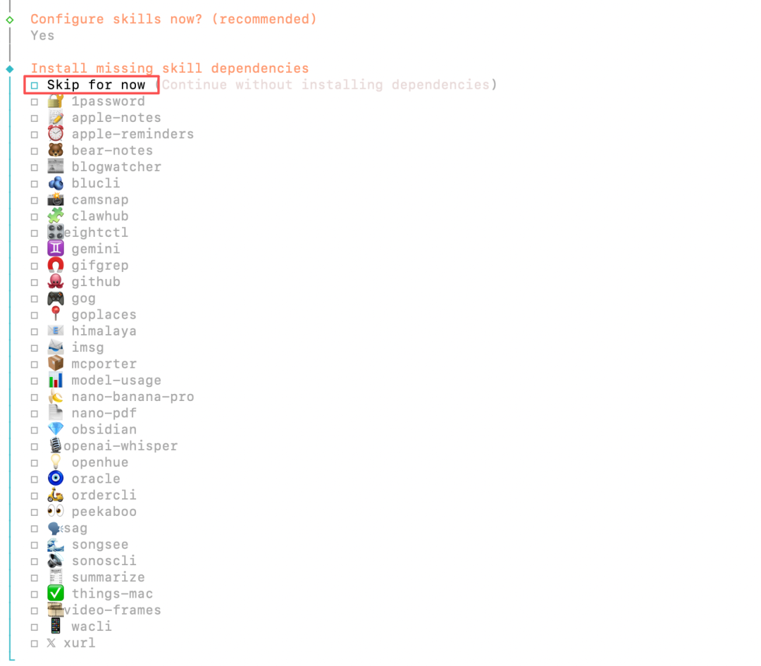 接下来继续初始化过程,到 skills 安装这一步可以先跳过,因为这些后续都可以通过和他对话来安装。