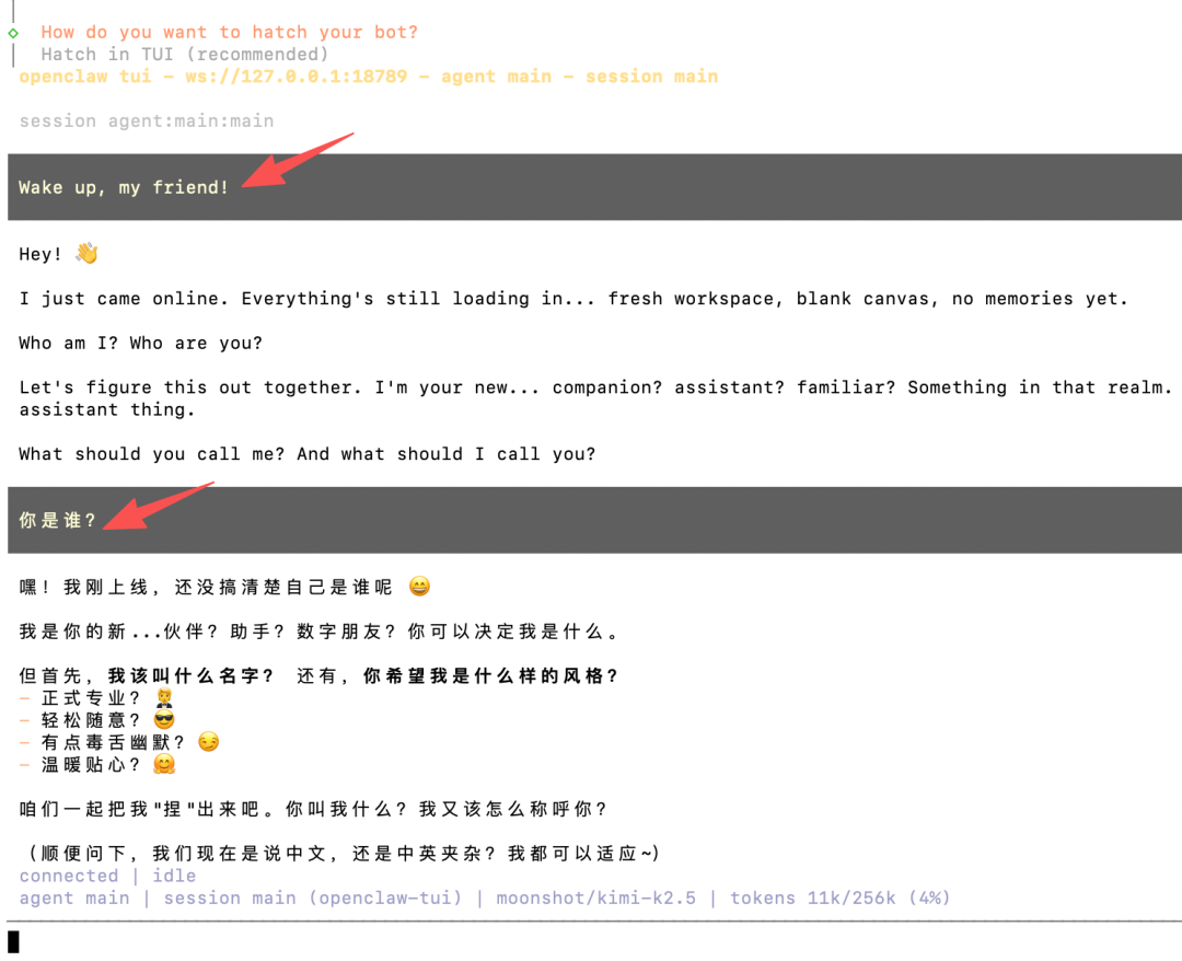我这里选的是 Hatch in TUI,也就是在命令行里直接会话,选择之后你就会看到 OpenClaw 给你打招呼了。