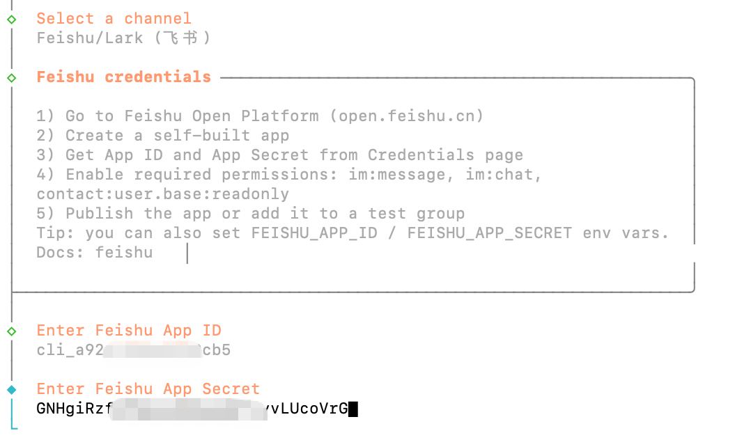 其实在上面的 OpenClaw 初始化过程中你已经看到过这个配置过程了,在那里可以选择飞书渠道,在要求你输入的地方粘贴你在飞书后台申请的机器人 AppID 和 App Secret。