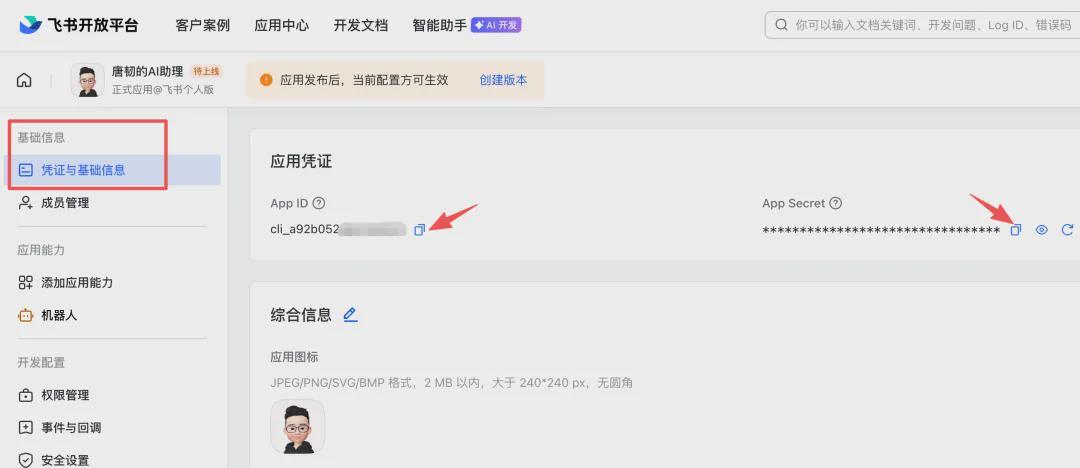获取这两个 ID 的地方在飞书开放平台的机器人配置信息里。