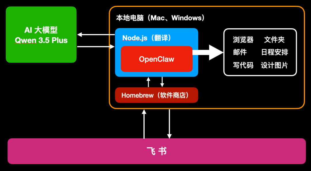 可以把 OpenClaw 看成一个外国人,这个翻译起到的作用就是把 OpenClaw 说的话翻译成我们本地电脑能看得懂的语言,然后电脑才能去执行动作。
