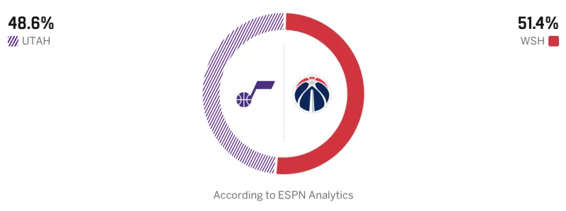 NBA直播-ESPN预测爵士vs奇才:爵士胜率48.6%,奇才胜率51.4%