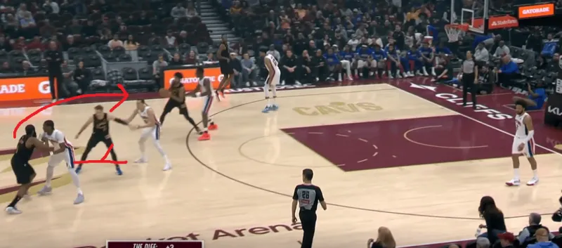 骑士高位三人配合,哈登skip出球给阿伦,随后利用梅里尔的掩护打接应,但梅里尔利用哈登吸引双人延误迅速切入接球,