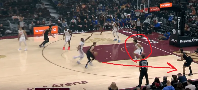 以更纯粹的形态作为空间点时,泰森也有很好的重新落位接应意识:施罗德持球突破走底线,泰森从上线向底角移动接应,利用坎宁安面对持球人的防守方式短暂抓住半空位出手机会: